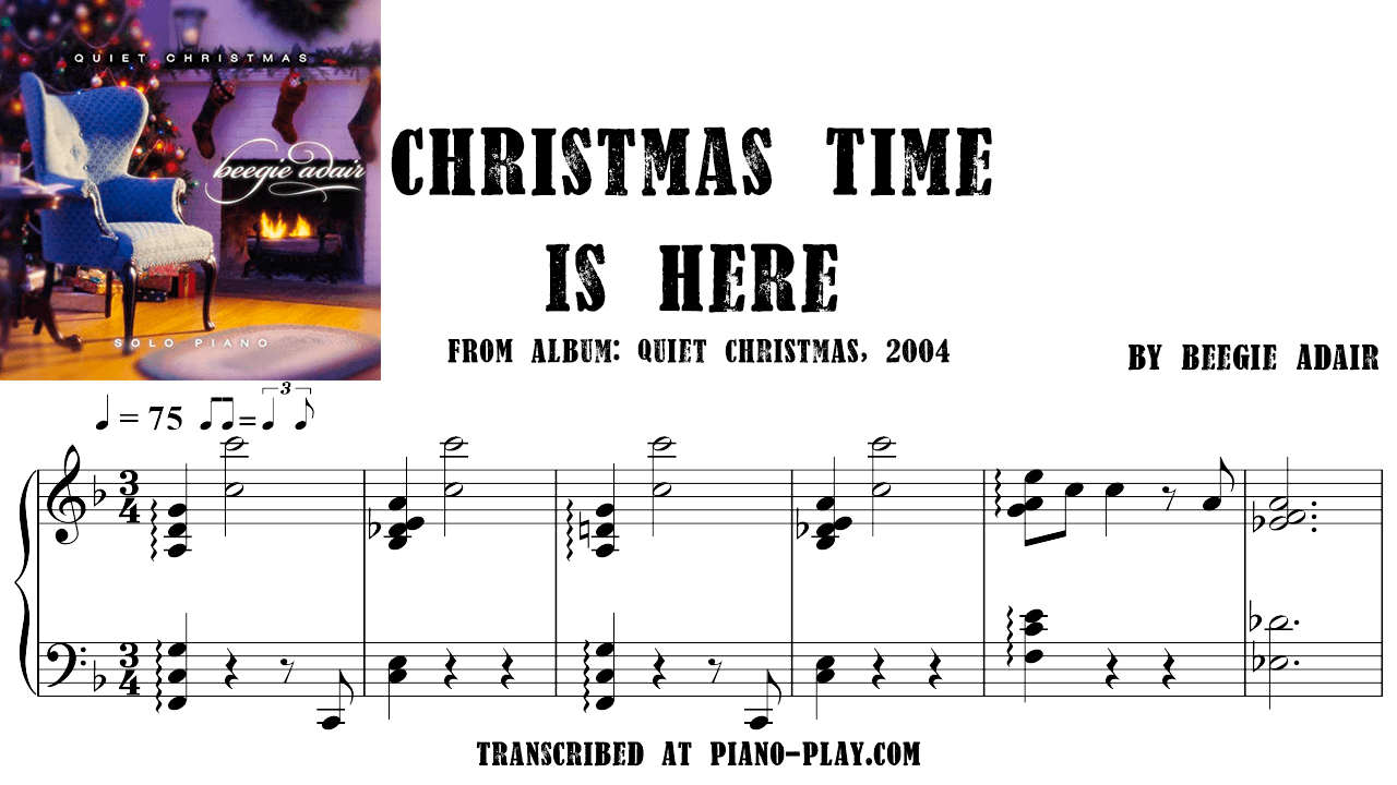 TITLE: Christmas Time Is Here INSTRUMENTATION: Jazz Piano Solo SOURCE: Quiet Christmas, 2004 DURATION: 2:40 TYPE: Transcription, Note-for-note, Sheet music, Score, Notes AVAILABLE: Online Download in PDF, MIDI, XML etc. ORIGINAL RECORDING: About the Transcription:The piano transcription Christmas Time Is Here of Beegie Adair is for left and right hand, note-for-note. Available by online download in several formats: PDF, MIDI, XML, SIB, MUS etc. This sheet music of Beegie Adair you can download on your PC and print in the real paper and playing at piano. This song we recommend for advanced piano musician who play the piano a long time. Also here you can see another Beegie Adair transcriptions which can help you to understand his piano music.