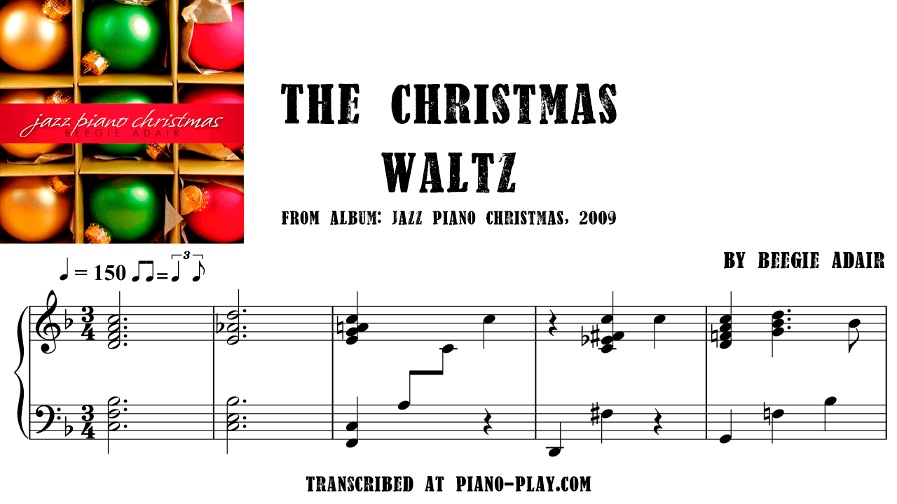 TITLE: The Christmas Waltz INSTRUMENTATION: Jazz Piano Solo SOURCE: Jazz Piano Christmas, 2009 DURATION: 2:44 TYPE: Transcription, Note-for-note, Sheet music, Score, Notes AVAILABLE: Online Download in PDF, MIDI, XML etc. ORIGINAL RECORDING: About the Transcription:The piano transcription The Christmas Waltz of Beegie Adair is for left and right hand, note-for-note. Available by online download in several formats: PDF, MIDI, XML, SIB, MUS etc. This sheet music of Beegie Adair you can download on your PC and print in the real paper and playing at piano. This song we recommend for advanced piano musician who play the piano a long time. Also here you can see another Beegie Adair transcriptions which can help you to understand his piano music.
