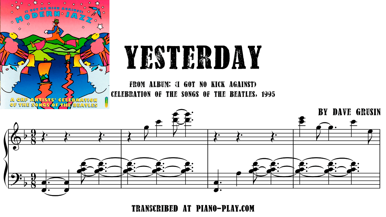 TITLE: Yesterday INSTRUMENTATION: Jazz Piano Solo SOURCE: (I Got No Kick Against) Modern Jazz, Celebration of the Songs of the Beatles, 1995 DURATION: 4:34 TYPE: Transcription, Note-for-note, Sheet music, Score, Notes AVAILABLE: Online Download in PDF, MIDI, XML etc. ORIGINAL RECORDING: About the Transcription:The piano transcription Yesterday of Dave Grusin is for left and right hand, note-for-note. Available by online download in several formats: PDF, MIDI, XML, SIB, MUS etc. This sheet music of Dave Grusin you can download on your PC and print in the real paper and playing at piano. This song we recommend for advanced piano musician who play the piano a long time. Also here you can see another Dave Grusin transcriptions which can help you to understand his piano music.