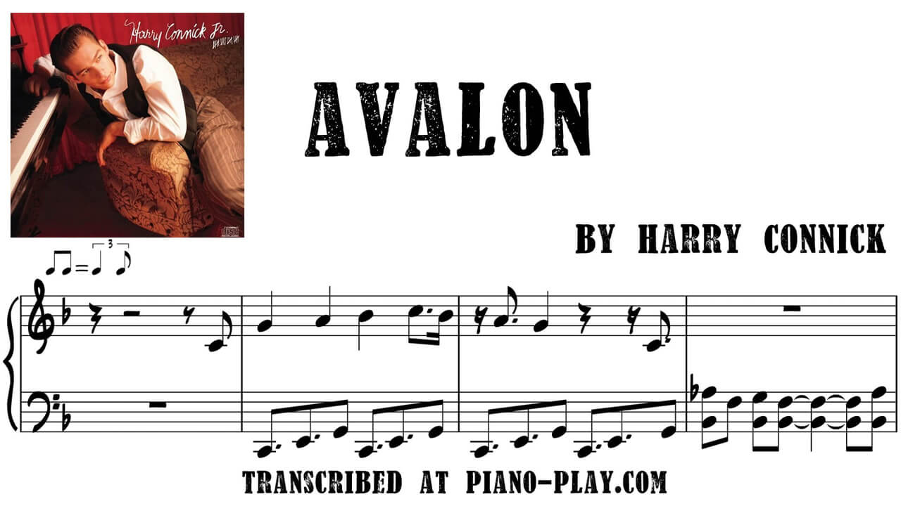TITLE: Avalon INSTRUMENTATION: Jazz Piano Solo SOURCE: album 20, 1992 DURATION: 3:46 TYPE: Transcription, Note-for-note, Sheet music, Score, Notes AVAILABLE: Online Download in PDF, MIDI, XML etc. ORIGINAL RECORDING: About the Transcription:The piano transcription Avalon of Harry Connick is for left and right hand, note-for-note. Available by online download in several formats: PDF, MIDI, XML, SIB, MUS etc. This sheet music of Harry Connick you can download on your PC and print in the real paper and playing at piano. This song we recommend for advanced piano musician who play the piano a long time. Also here you can see another Harry Connick transcriptions which can help you to understand his piano music.